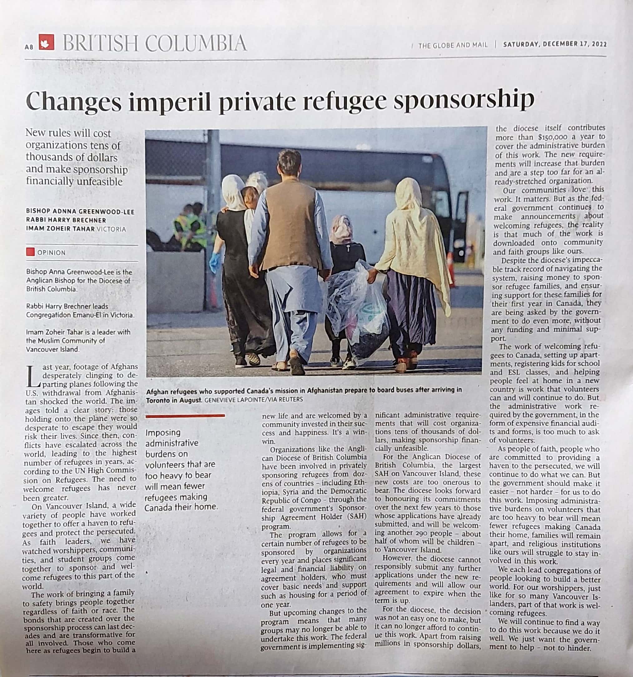 OBRF works closely with several refugee support organizations and private sponsorship groups. This Globe and Mail article was written in collaboration with Bishop Anna Greenwood-Lee, Anglican Bishop for the Diocese of British Columbia, Rabbi Harry Brechner, Congregation Emanu-El leader, and Imam Zoheir Tahar, Vancouver Island Muslim community leader.